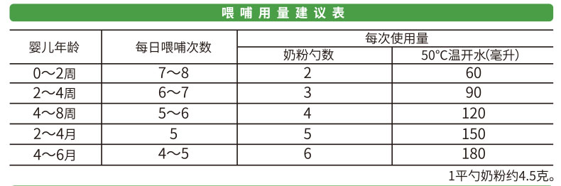 依照喂哺用量建議表,加入正確份量(平勺)的奶粉,請勿刻意壓平量勺。